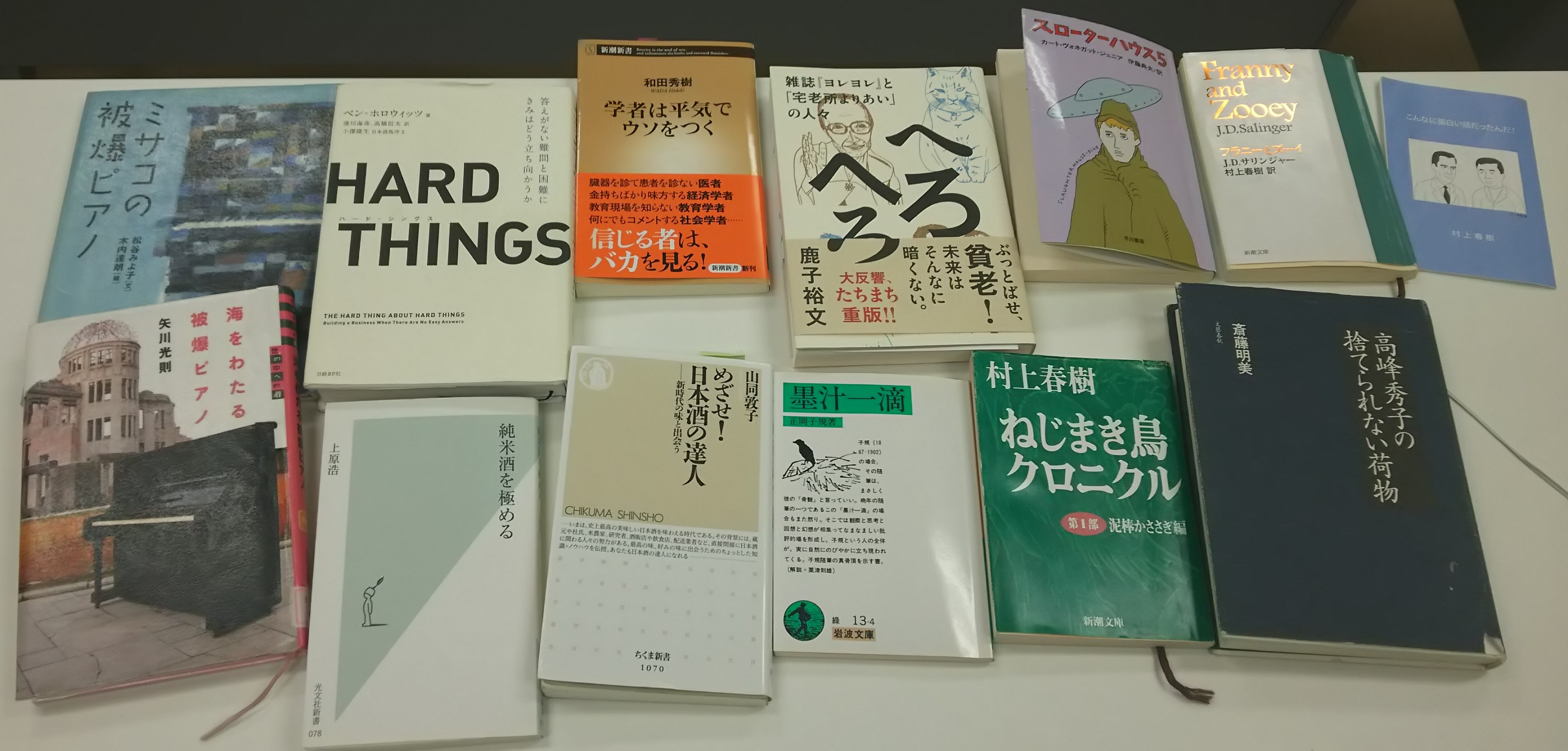 [amazonjs asin=”4480067752″ locale=”JP” title=”めざせ!日本酒の達人: 新時代の味と出会う (ちくま新書)”][amazonjs asin=”4334031781″ locale=”JP” title=”純米酒を極める (光文社新書)”][amazonjs asin=”4003101340″ locale=”JP” title=”墨汁一滴 (岩波文庫)”][amazonjs asin=”410610654X” locale=”JP” title=”学者は平気でウソをつく (新潮新書)”][amazonjs asin=”4062163519″ locale=”JP” title=”世の中への扉 海をわたる被爆ピアノ”][amazonjs asin=”4062141345″ locale=”JP” title=”ミサコの被爆ピアノ”][amazonjs asin=”4822250857″ locale=”JP” title=”HARD THINGS”][amazonjs asin=”415010302X” locale=”JP” title=”スローターハウス5 (ハヤカワ文庫SF ウ 4-3) (ハヤカワ文庫 SF 302)”][amazonjs asin=”4101001413″ locale=”JP” title=”ねじまき鳥クロニクル〈第1部〉泥棒かささぎ編 (新潮文庫)”][amazonjs asin=”4101386811″ locale=”JP” title=”高峰秀子の捨てられない荷物 (新潮文庫)”][amazonjs asin=”4904292642″ locale=”JP” title=”へろへろ 雑誌『ヨレヨレ』と「宅老所よりあい」の人々”][amazonjs asin=”4102057048″ locale=”JP” title=”フラニーとズーイ (新潮文庫)”]